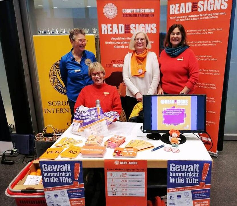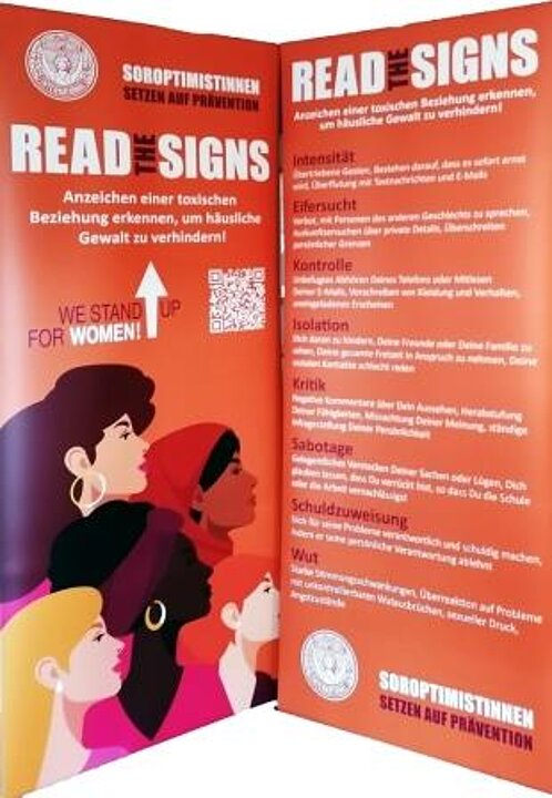 Ab dem 25. November hatte Soroptimist International Deutschland (SID) die Aufklärungskampagne „Read the Signs“ - „Erkenne die Zeichen“ gestartet. Wie im vergangenen Jahr richtete sich die Kampagne nicht nur an die Opfer, sondern auch an alle, die Zeugen von Gewalt gegen Frauen werden, und im besten Fall auch an die (potentiellen) Täter. Neu hinzu kam in diesem Jahr die Komponente - „Mental Health" - "Psychische Gesundheit" mit dem. Ziel, das Thema psychische Gesundheit mit der Prävention von häuslicher Gewalt zu verknüpfen.