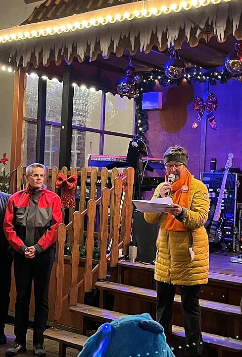 Im Anschluss an die Eröffnung des Weihnachtsmarkts durch Oberbürgermeister Marcus Hoffeld wies Präsidentin Renate Memmesheimer auf den Schwerpunkt der diesjährigen Orange Days hin, auf die Prävention häuslicher Gewalt, was als drängendes Problem bereits im vergangenen Jahr gestartet wurde. Frau Memmesheimer legte beeindruckende Zahlen dafür vor, dass dies weiterhin bitter nötig ist. Sie berichtete über das Erkennen von Warnzeichen, um physische und psychische Gewalt bereits im Vorfeld zu verhindern.