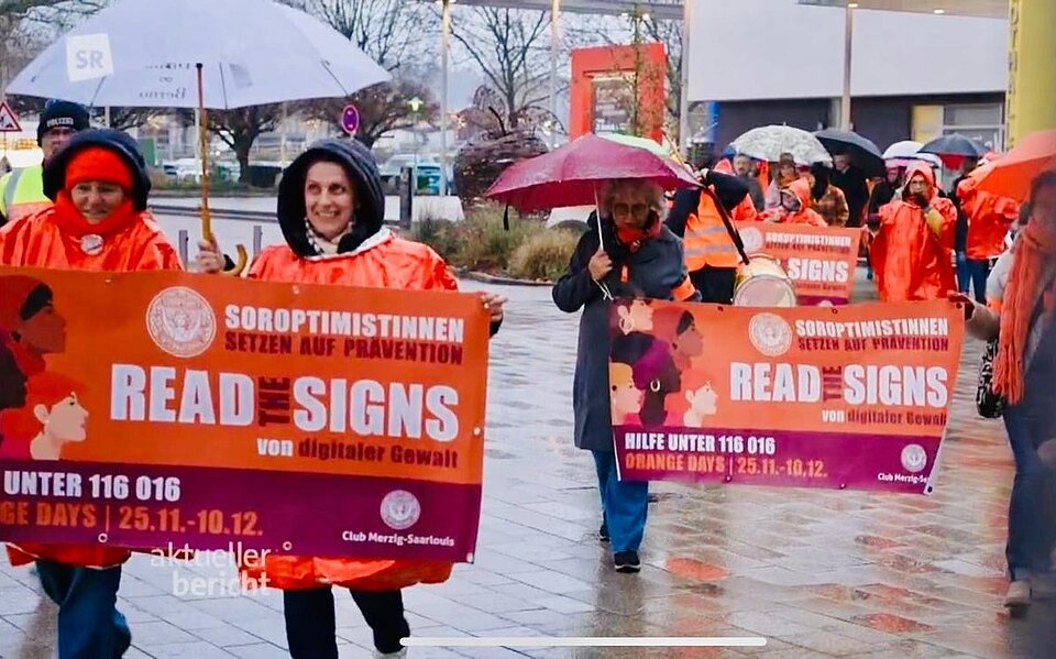 Am Treffpunkt vor der Stadthalle erinnerte Club-Präsidentin Dr. Sigrid Bitsch an das Ausmaß der Problematik. Gewalt gegen Frauen habe viele Gesichter – analog wie digital – und finde häufig im häuslichen Umfeld statt. „Alle zwei Minuten erfährt in Deutschland eine Frau Gewalt“, mahnte sie. Im Saarland seien im vergangenen Jahr 2.700 Frauen Opfer häuslicher Gewalt geworden, für fünf von ihnen endete die Gewalt tödlich. „Das alles ist für uns nicht hinnehmbar.“