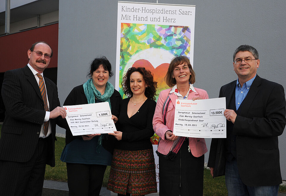 Über die finanziellen Zuwendungen freuten sich (von links): Aloisius Tritz (Saarbrücker Zeitung), Beate Leonhard-Kaul, Kinderhospizdienst, Angelika Hießerich-Peter und Dr. Sigrid Bitsch (beide Club Soroptimist Merzig-Saarlouis) sowie Paul Herrlein, St. Jakobus-Hospiz Saarbrücken.