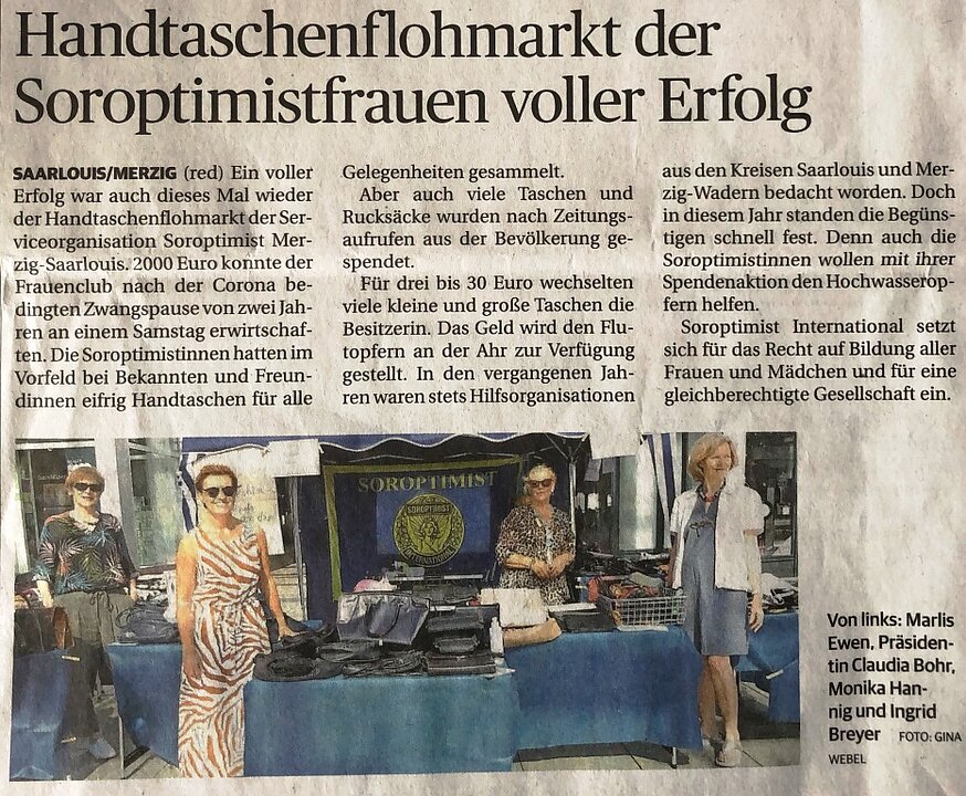 Nach der Corona bedingten Zwangspause in 2020 konnten wir in diesem Jahr 2.000 € erwirtschaften. Dieser Erlös wird den Flutopfern an der Ahr zur Verfügung gestellt, konkret dem Soroptimist Club Bitburg-Prüm für sein Projekt "Sprungtuch", mit dem den Opfern der Flutkatastrophe im Ahrtal direkte Hilfe geleistet wird.