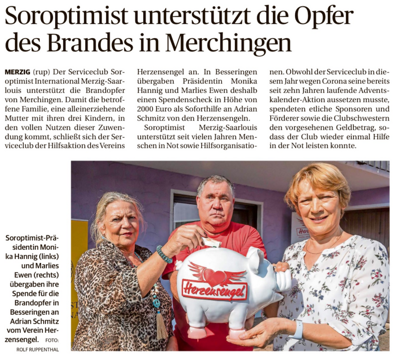 Die Spende wird als Soforthilfe für das Projekt "Brandopfer Merchingen" eingesetzt, ein Projekt, zu dem der Verein Herzensengel e.V., die Kreisstadt Merzig sowie der Landkreis Merzig-Wadern gemeinsam aufgerufen haben.