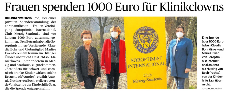 Bei einer privaten Sammlung unserer Clubschwestern kamen 1.000 Euro für das Projekt „Klinikclowns“ der Kinderhilfe Saar e.V. zusammen. Dieses Geld übergaben Präsidentin Claudia Bohr und Schriftführerin Marlies Ewen am Dillinger Ökosee der stellvertretenden Vorsitzenden der Kinderhilfe Saar e.V., Antonia Nutting von Boch. Leider müssen wir zurzeit Corona-bedingt auf Aktionen in der Öffentlichkeit verzichten.