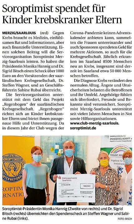 Die Spende wird für das neue Projekt "Regenbogen" eingesetzt, ein Projekt, mit dem die Saarländische Krebsgesellschaft e.V. ein spezielles Programm für Kinder krebskranker Eltern aufgelegt hat.