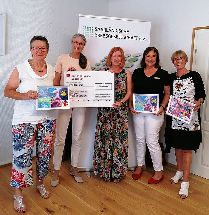 Am 14. Juni 2023 übergaben Präsidentin Renate Memmesheimer und Dr. Anja Blaes-Salz an Sabine Rubai, Geschäftsführerin der Saarländischen Krebsgesellschaft, einen Spendenscheck in Höhe von 2.000 € für das Projekt "Regenbogen".