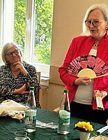 Zum Abschluss übergab Clubschwester Elfriede Klein an diesem schwülen Frühsommertag den anwesenden Damen und dem Herrn vom Vereinsvorstand einen Rosenfächer mit Motiven von „Soroptimist Women’s Voice“, der Rose der Soroptimistinnen. Die Rose steht für die Frauen, die aktiv waren und sind, ihre Stimme erhoben haben und das soziale und kulturelle Leben gefördert haben.